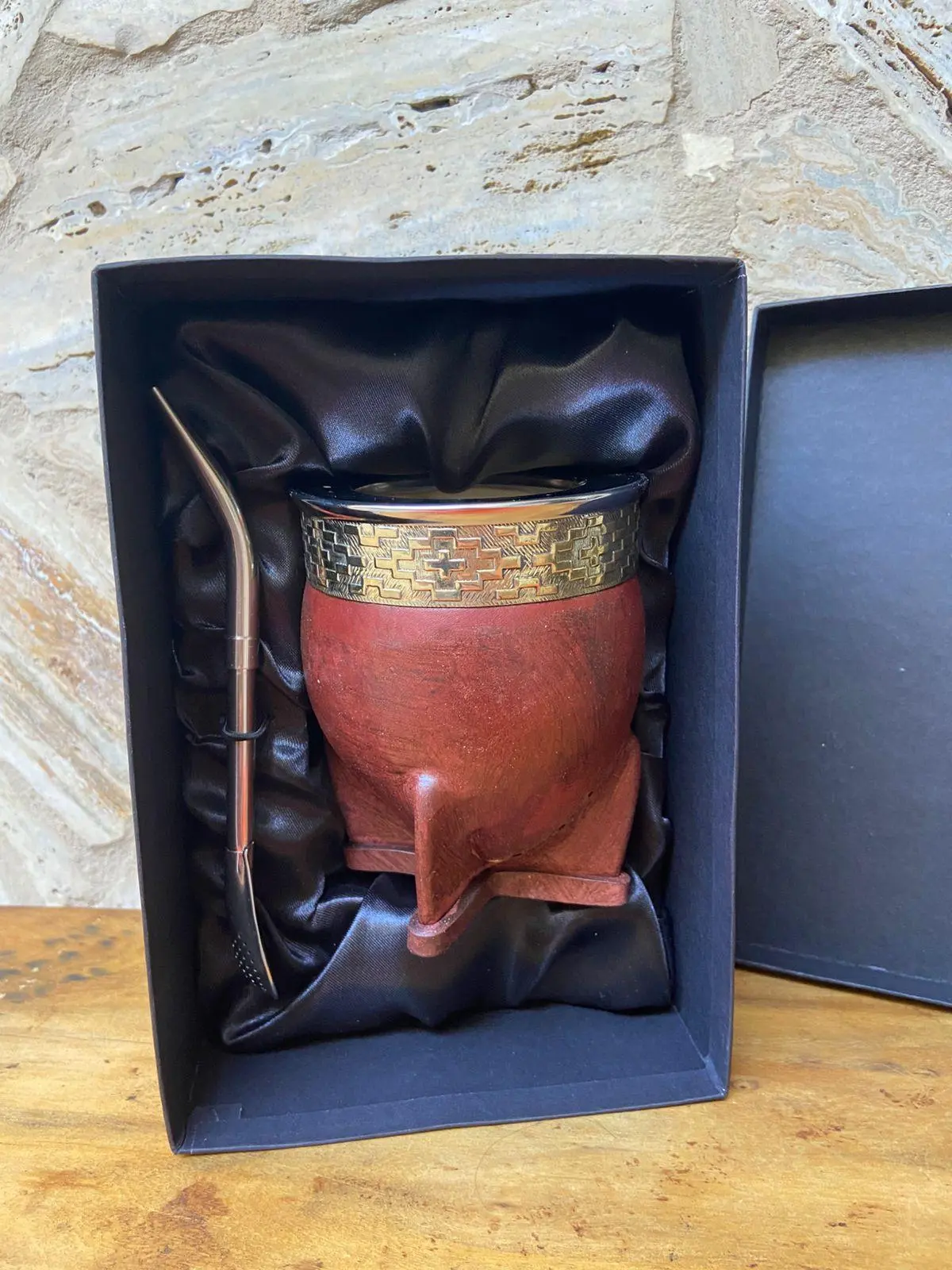 • Hecho de calabaza natural, revestida en cuero liso color rojo bordó.