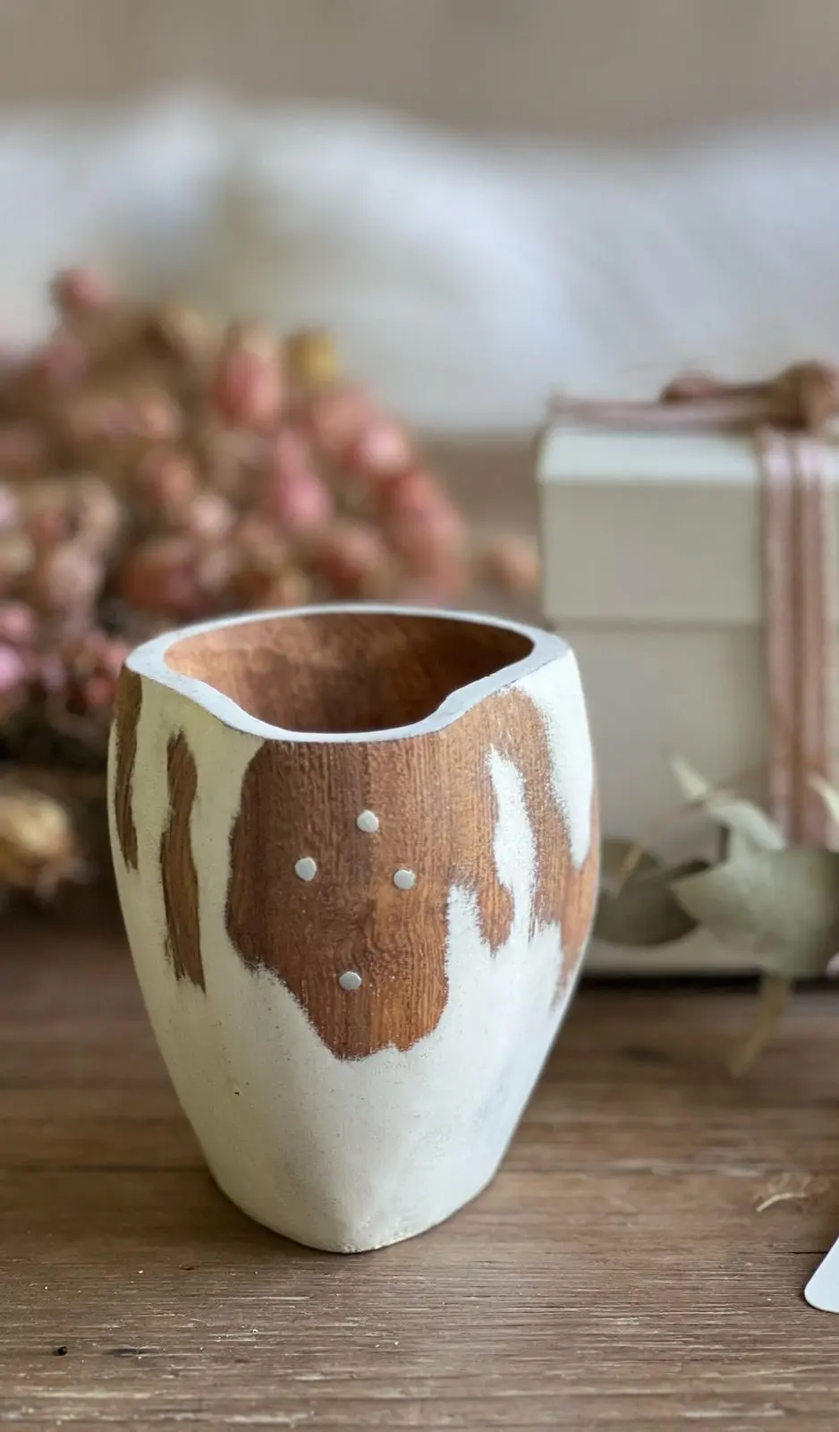 • Presenta puntos blancos pintados a mano que aportan un detalle delicado y artesanal.